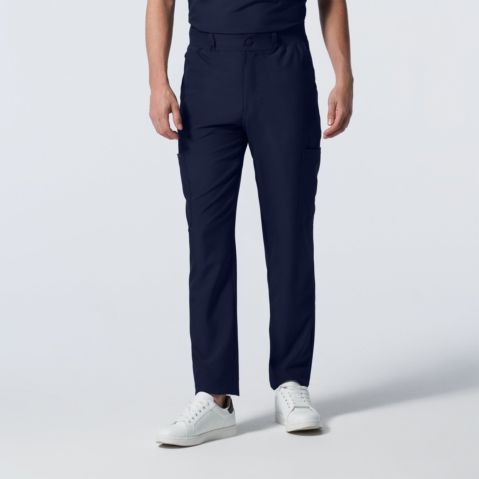 These versatile Men's fit, zip fly, tapered leg pant have a stretchy rib knit waistband with an internal adjustable drawstring, for comfort and security. This pant also provides a generous amount of storage that meets the demands of your busy workday with 2 front pockets, 2 Cargo pockets, 2 Back pockets and a bonus hidden front money clip pocket and a hidden back zip pocket.