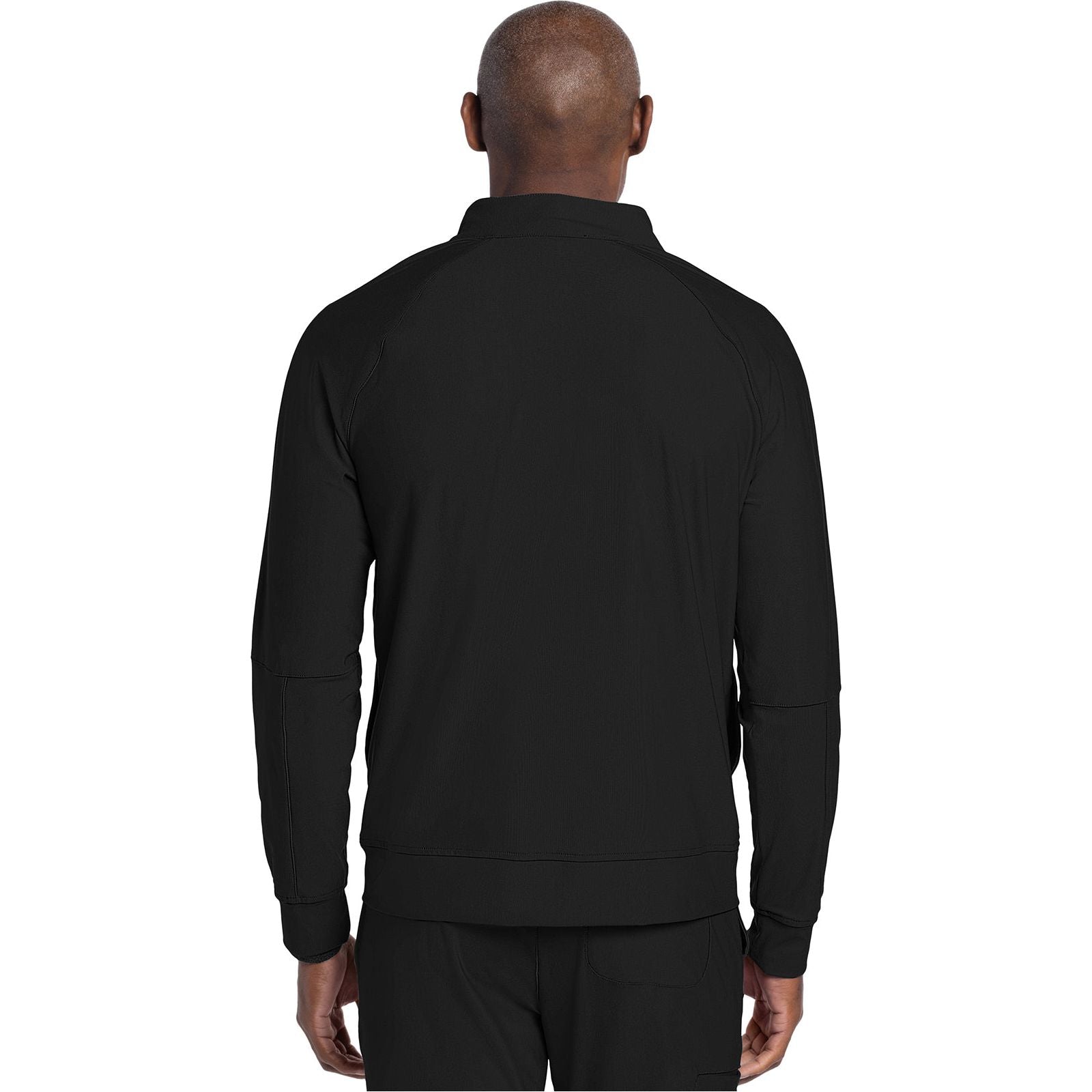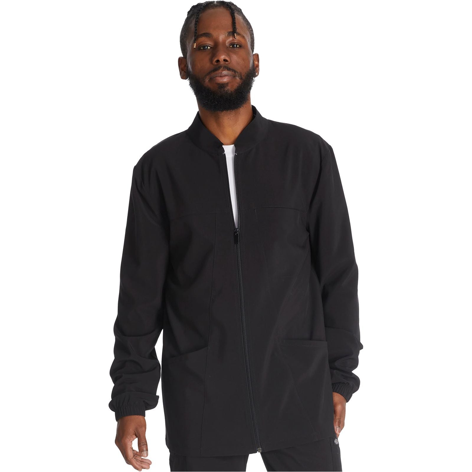 A Men's Modern fit zip front jacket features back side panels, collar, cuffs and waistband made with a stretch rib knit for extra comfort. Also featured are a logo zipper pull, front chest pocket with security zip closure, patch pockets, and an instrument loop and sectional pocket on the left sleeve. Center back length: 28" . The comfortable stretch poplin fabric and super stretchy rib knit is the perfect combo for healthcare professionals.