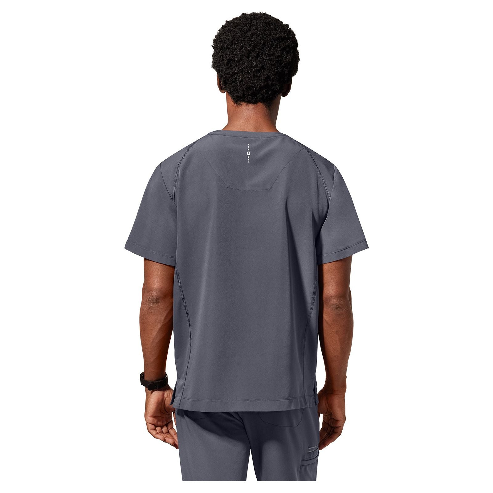 3 pocket V-neck top features 1 chest welt pocket & 2 front welt pockets. It has athletic flatlock stitching with eyelet trim on side front panels.