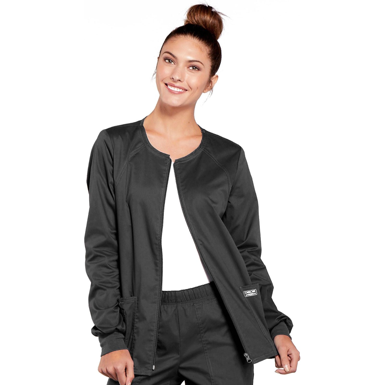 A Contemporary fit, sporty zip front jacket features front and back shoulder yokes, front princess seams with flat piping, hidden pockets with a zipper closure and a logo zipper pull. The back panel, collar, cuffs and waistband are made in a stretch rib knit for extra comfort. Coverstitch detail throughout. Center back length: 26". The comfortable stretch poplin fabric and super stretchy rib knit is the perfect combo for healthcare professionals.